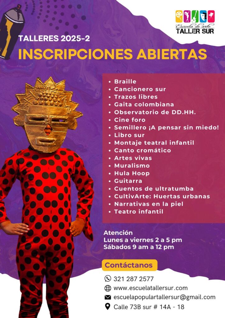La fundación escuela de arte taller sur es un proceso organizativo de formación artística popular, ubicado en la localidad quinta de Usme, al sur de Bogotá, un territorio rico en manifestaciones artísticas individuales y colectivas, que reclaman entornos para el diálogo e intercambio de experiencias.